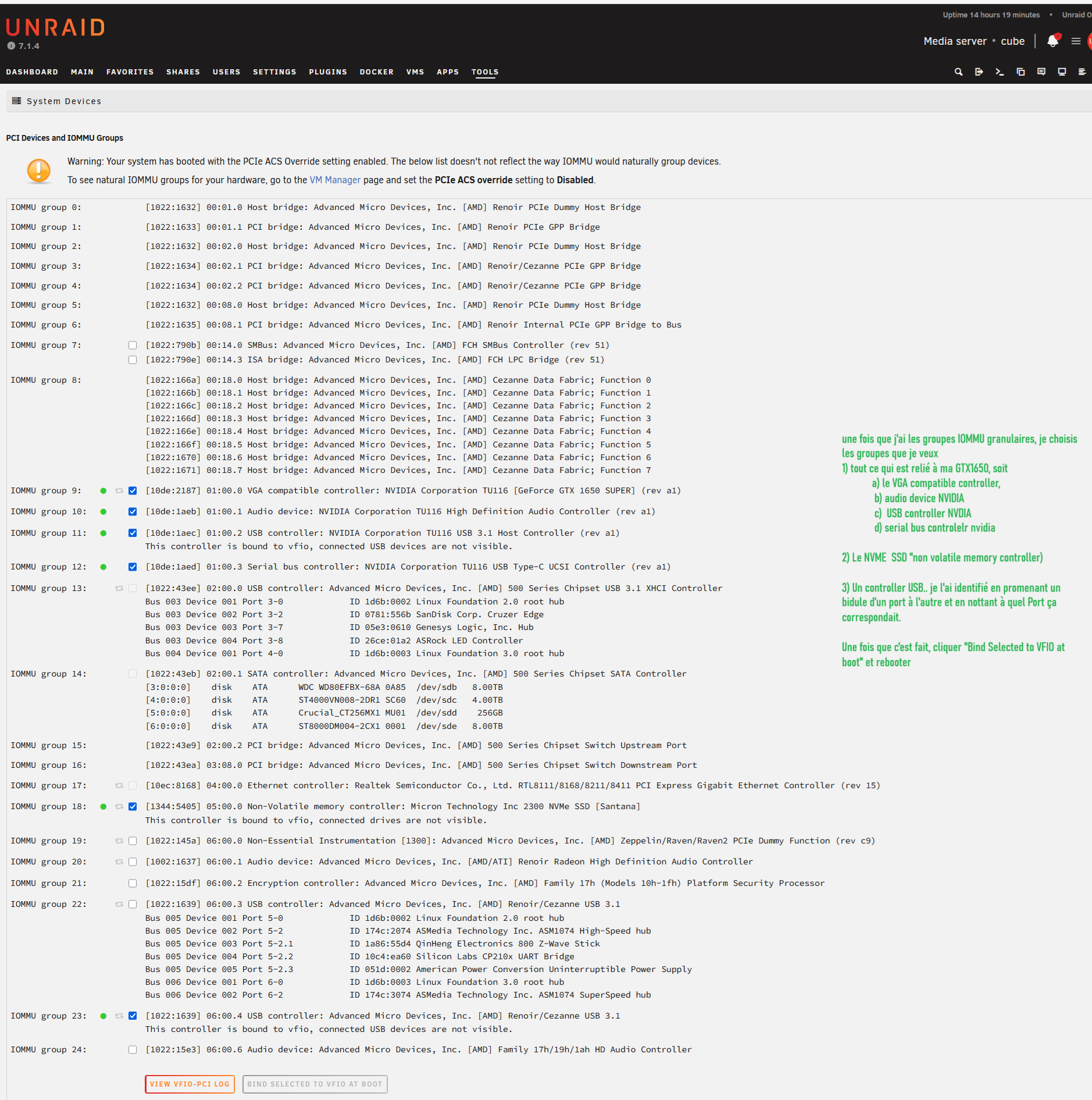 Mon problème, c’est que plusieurs devices sont dans le même IOMMU group. Par exemple, si je veux passer mon GPU nvidia je dois aussi passer d’autres devices que je veux garder disponible pour unraid et les docker.