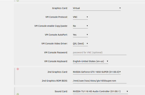 au début (avant D’installer moonlight pour le remote desktop) j’ai configuré la VM avec le virutal display adapter ET la gtx 1650 comme 2e display adapter pour le moment, il faut peser sur le petit “+” subtil en vert ici:
