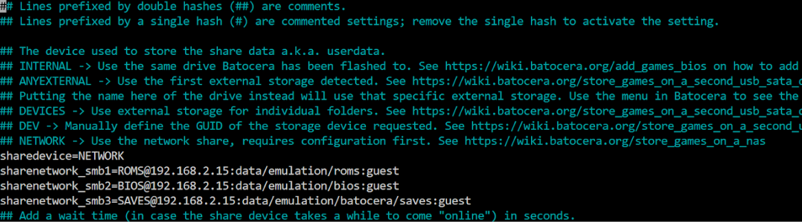 sharedevice=NETWORKsharenetwork_smb1=ROMS@192.168.2.15:data/emulation/roms:guestsharenetwork_smb2=BIOS@192.168.2.15:data/emulation/bios:guestsharenetwork_smb3=SAVES@192.168.2.15:data/emulation/batocera/saves:guestumount /mnt/batocera_imglosetup -d /dev/loop4Restart batocera, update the gamelist (From the main menu ([start]) Game settings -> Update Gamelists) (documentation https://wiki.batocera.org/menu_tree#update_gamelists)
