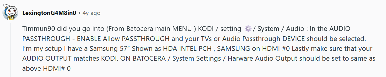 LexingtonG4M8in0 on reddit : Timmun90 did you go into (From Batocera main MENU ) KODI / setting ⚙️/ System / Audio : In the AUDIO PASSTHROUGH - ENABLE Allow PASSTHROUGH and your TVs or Audio Passthrough DEVICE should be selected. I’m my setup I have a Samsung 57” Shown as HDA INTEL PCH , SAMSUNG on HDMI #0 Lastly make sure that your AUDIO OUTPUT matches KODI. ON BATOCERA / System Settings / Harware Audio Output should be set to same as above HDMI# 0