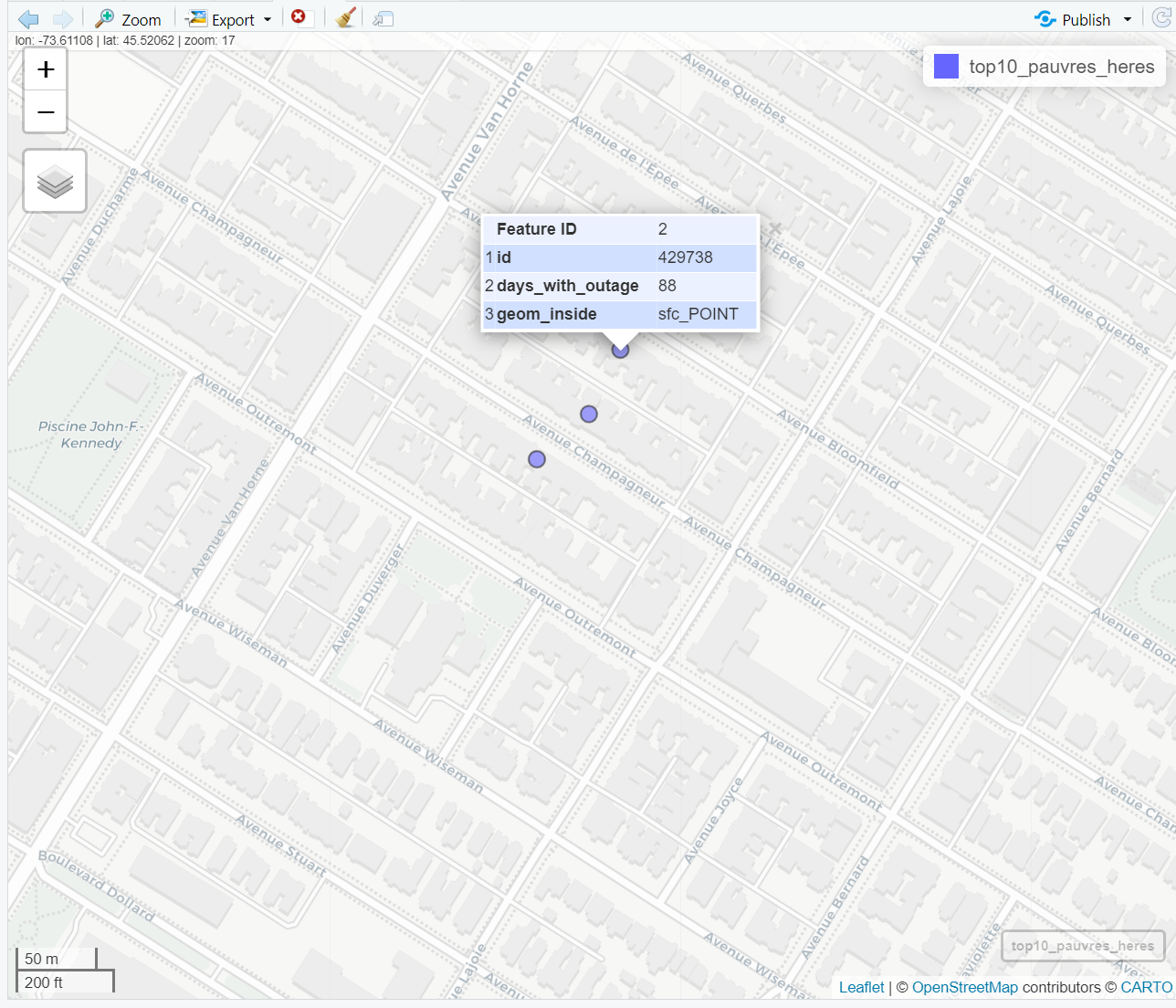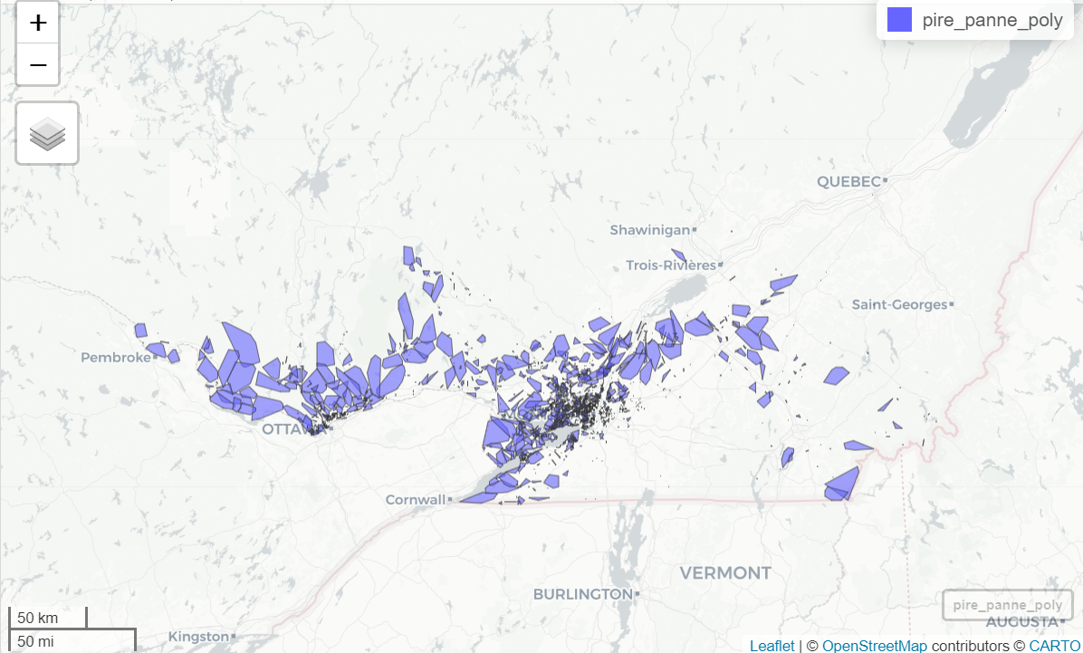 Mon processus d’ingestion de données a simplement été de faire une boucle sur les 39 000 KMZ, d’ajouter un peu de metadata aux polygones ( source_file, source_path et row_number) et d’append ça à la table “outages” sur mon serveur postgis.