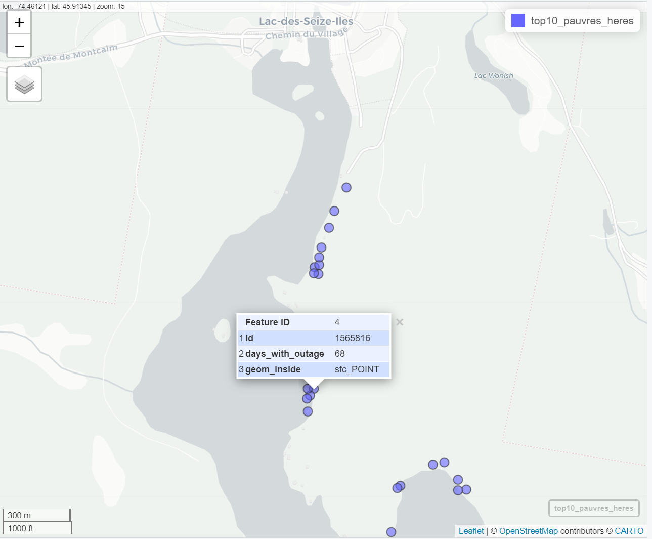 Ensuite j’ai lu chacun des KMZ, j’ai ajouté un peu de metadata aux pannes (outage_start, outage_end, outage_duration_sec, row_num, file_name) et j’ai ajouté ça à mon serveur PostGIS.